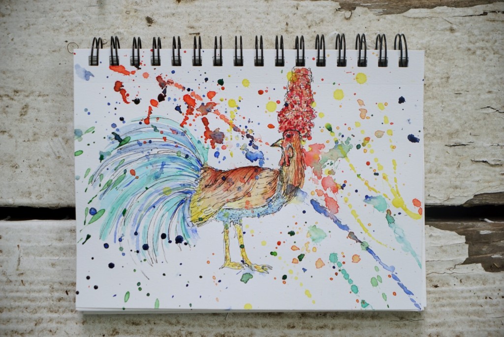 bird, hair, illustration, rooster, watercolor