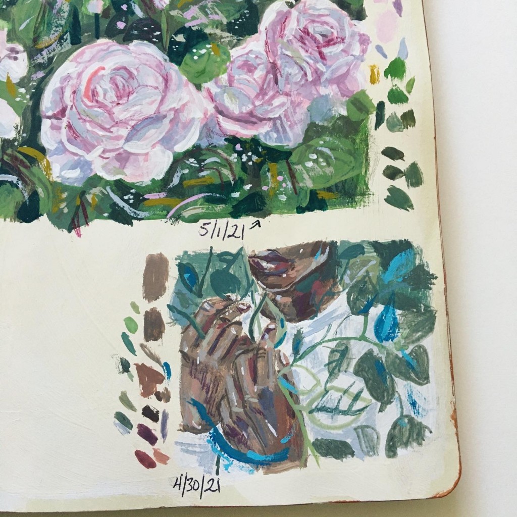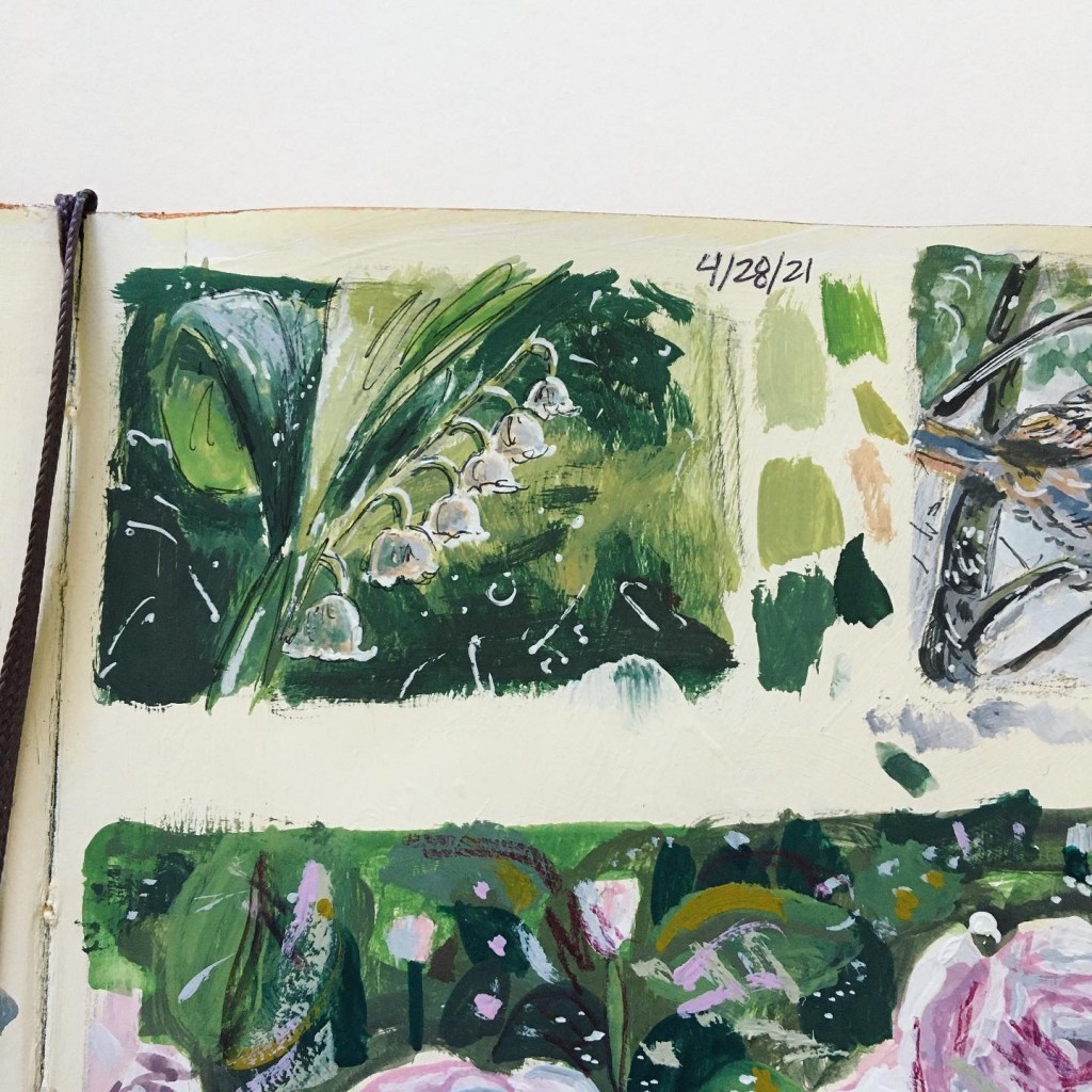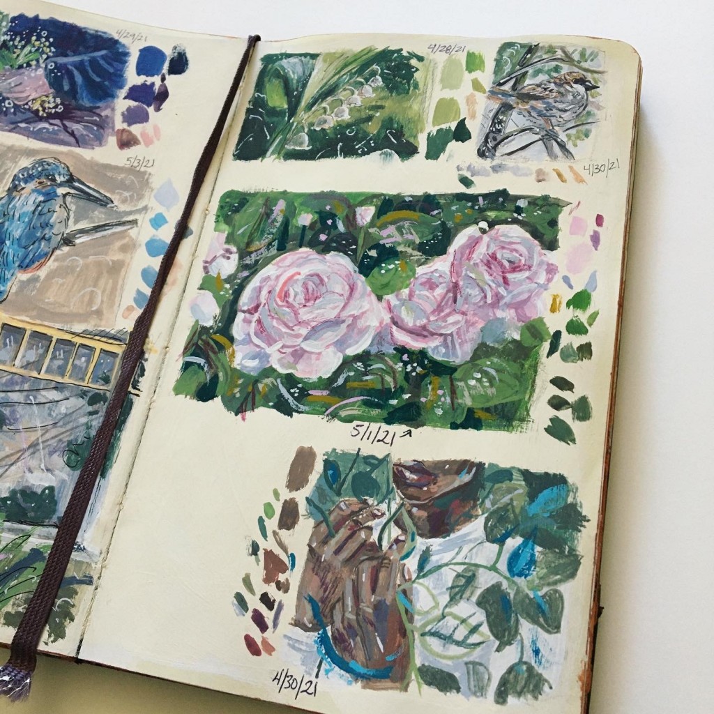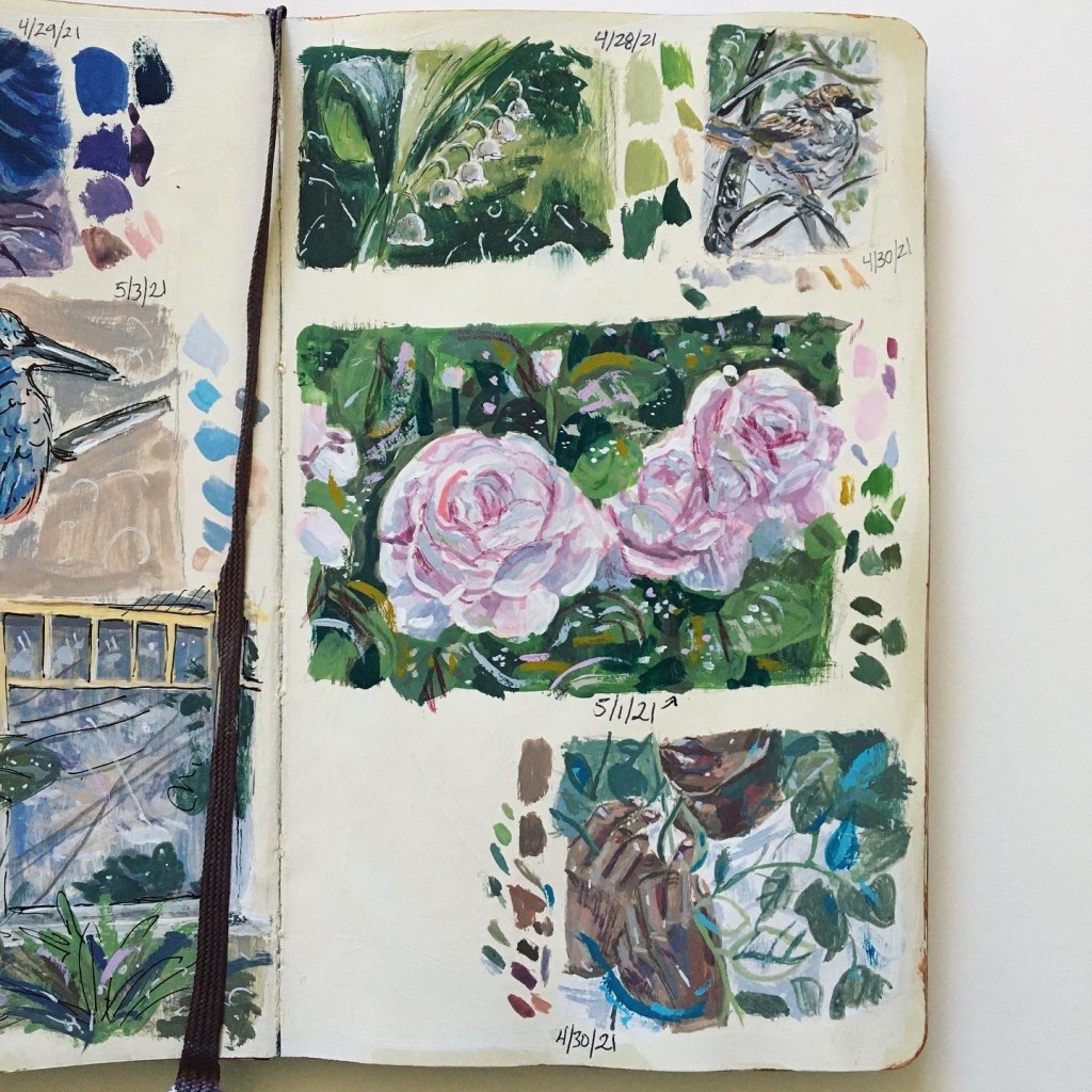 bird, floral, flowers, gouache, ink, journal, journaling, leaves, pen, sketchbook, watercolor