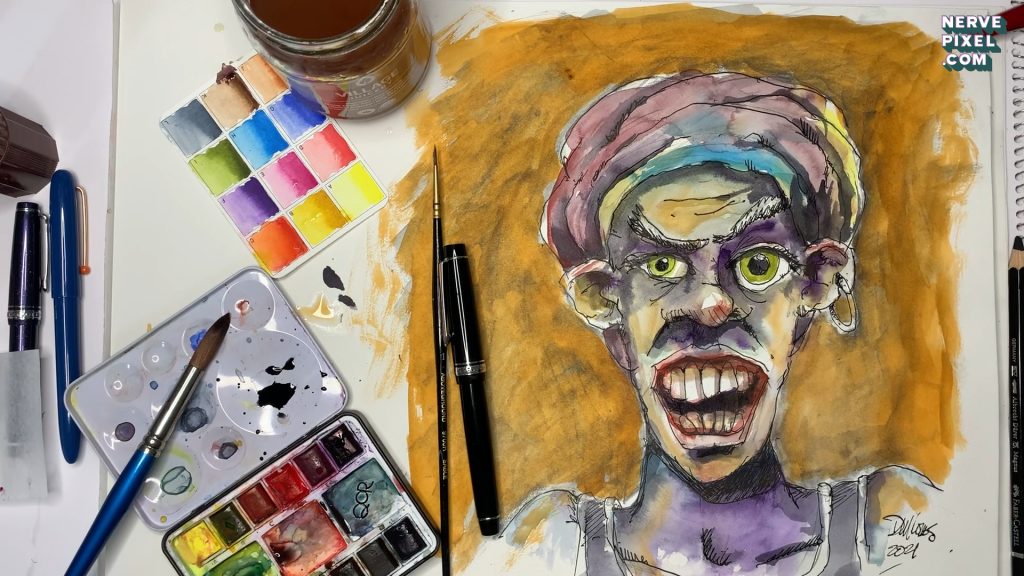 A sketch from life of a wandering Man exploiting his feline companion for coins and dollars. The Cat was dressed in a sweater and scarf.