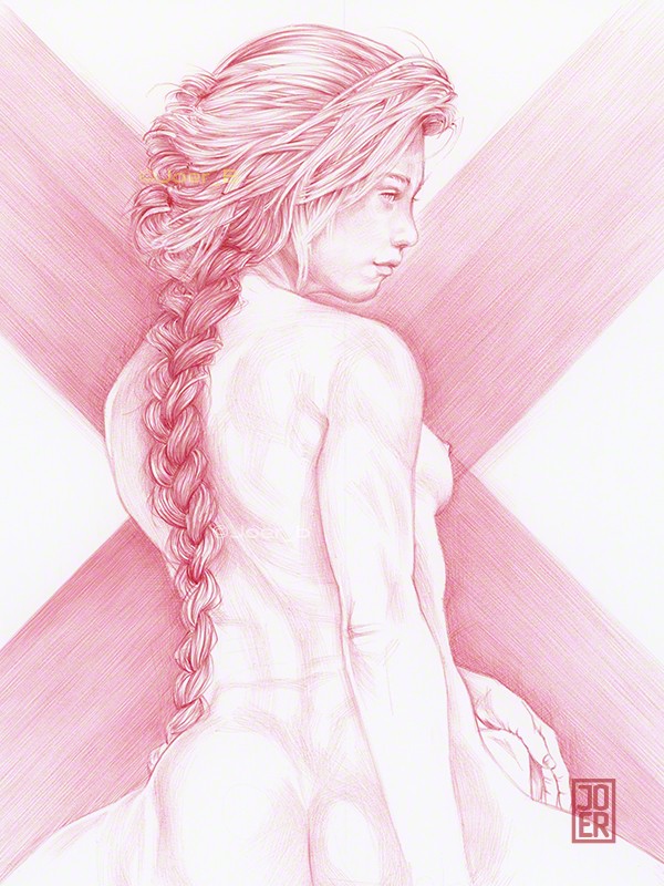 A drawing of Amy with her hair braided and tied with a red silk sash.