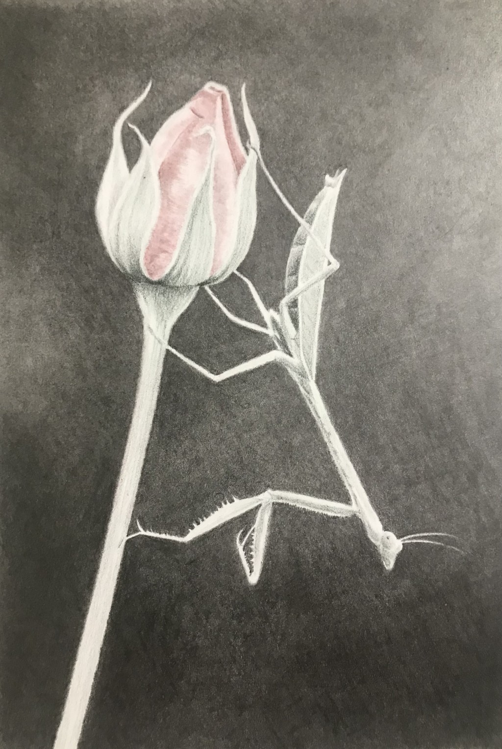 Mantid on a rose bud was done on Strathmore Bristol with Derwent Graphitint (tinted graphite) pencils. I love these insects and they are all over the rose bushes this time of year. I tried to capture her natural grace and beauty as she stepped down from her rose bud perch while eyeing her prey.