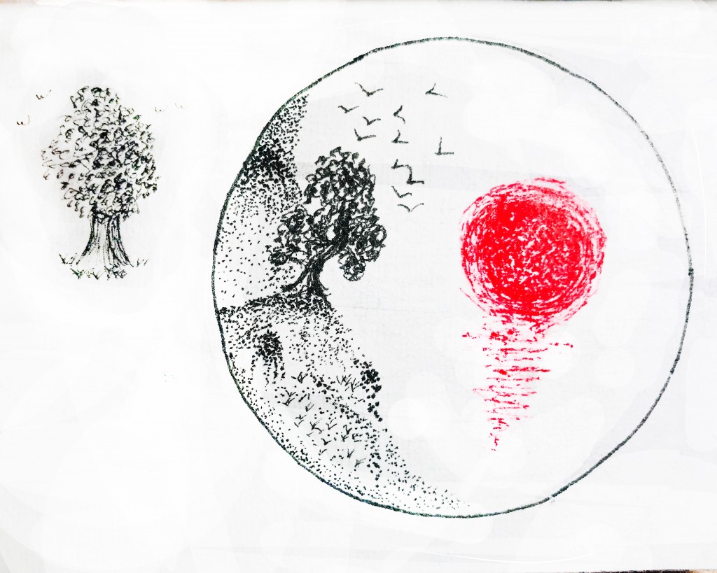 I like this a lot. Especially the way you've drawn the sun and used stippling for the ground.