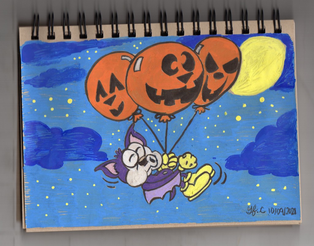 Tried my Poscas on a sheet of toned tan paper in my sketchbook, and doodled up this cute rubber hose like bat character enjoying a nice Halloween night while being carried by 3 spooky/funny jack -0-lantern balloons.