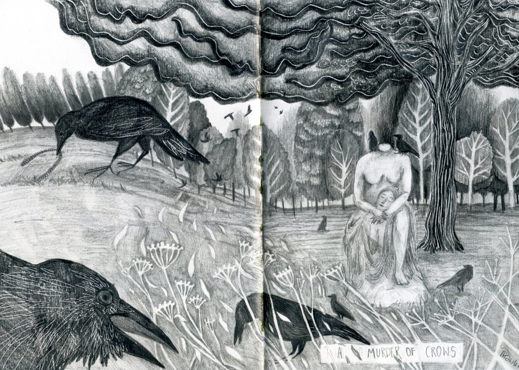 Some time ago I was living near a massive park in London called The Crystal Palace Park. It is a beautiful and spacious park , where are some old sculptures randomly placed around park. Especially this, a headless one cached my attention, because there were always lots of crows around the sculpture. So both things inspired each other very fluidly on the paper and create this atmospheric narrative. I am very glad you like it :) Thank you kindly :) x
