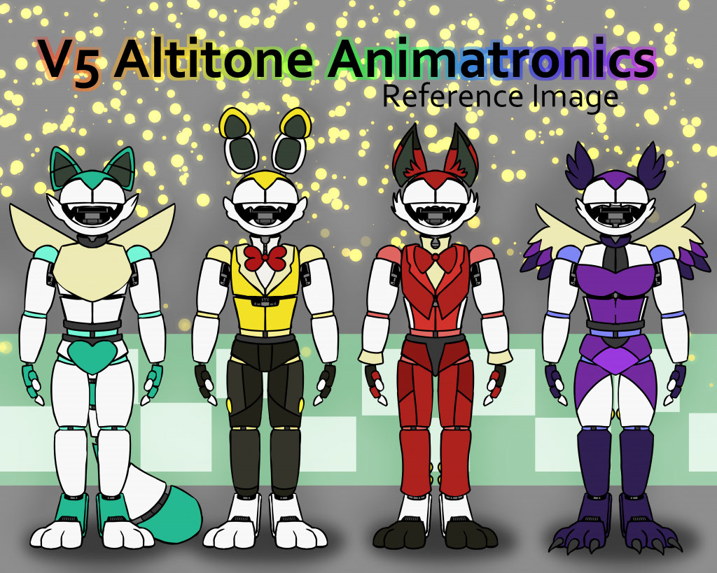 Creating robots is sort of a coping mechanism for me, and Jester. We have Elizabeth, as always, and some different characters --- Paris the fox, who plays the guitar, and Altero, the rabbit, who does the drums. Finally, Carol, who plays the piano --- these new characters resemble Preistor, Altor, and Lexibo respectfully --- but I changed their animal associations because a bear and a rabbit were just too close to Freddy's band. Now all we have to worry about is the rabbit. Oh, and Carol is an owl.
