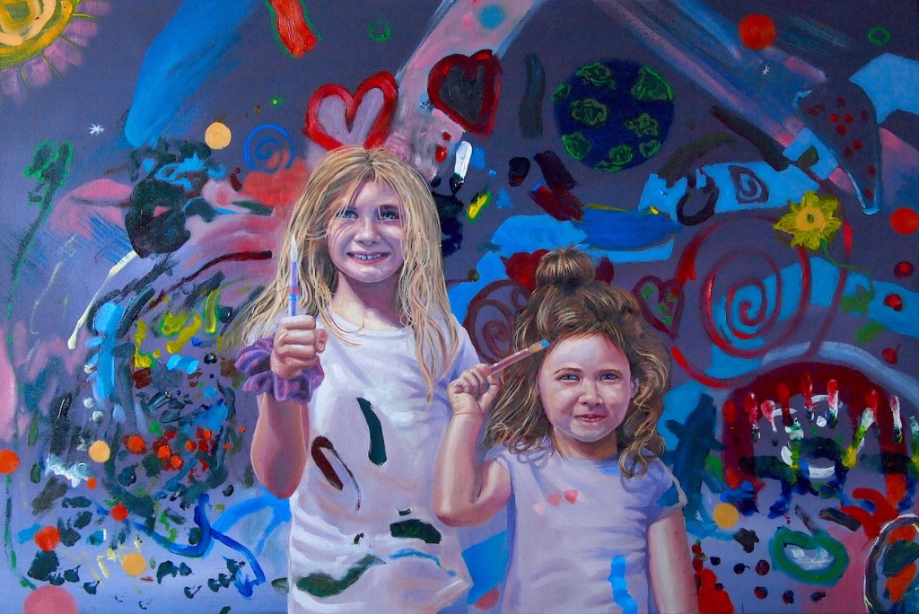 A friend's children painted a canvas I gave them and I painted them into it. The fun messy doodle background is 90% theirs. I added a few streams to pop out some of the shapes they painted. I might do this as a series.