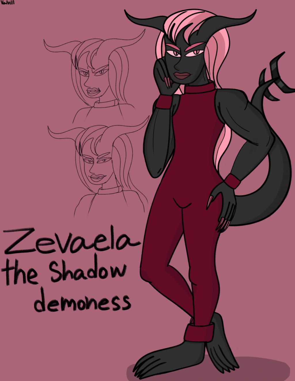 She stands at 6'4,wth a deep voice and long pink hair and muscles,Zevaela is combative and quick like all shadow demons.she is friends with Tenebris and Dezajed,sometimes Tenebris annoys her and fights her,She and Dezajed are very "close" friends.She has a shadow and a monstrous form like all shadow demons have,sometimes she struggles to return to her normal form.she is great at flying whenever she has her large wings present.she's also great at tail wrestling too.