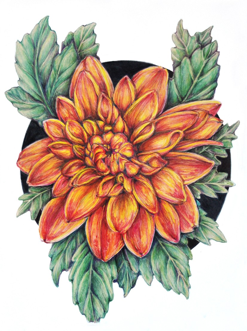 Love dahlias, not just because they are so ornate, but also because they bloom so very late. The tuberous begonias and potted dahlias are still in full bloom at the start of November, how cool is THAT? (For the northern hemisphere and 47th parallel, no less!) This is a stylized drawing in colored pencils.