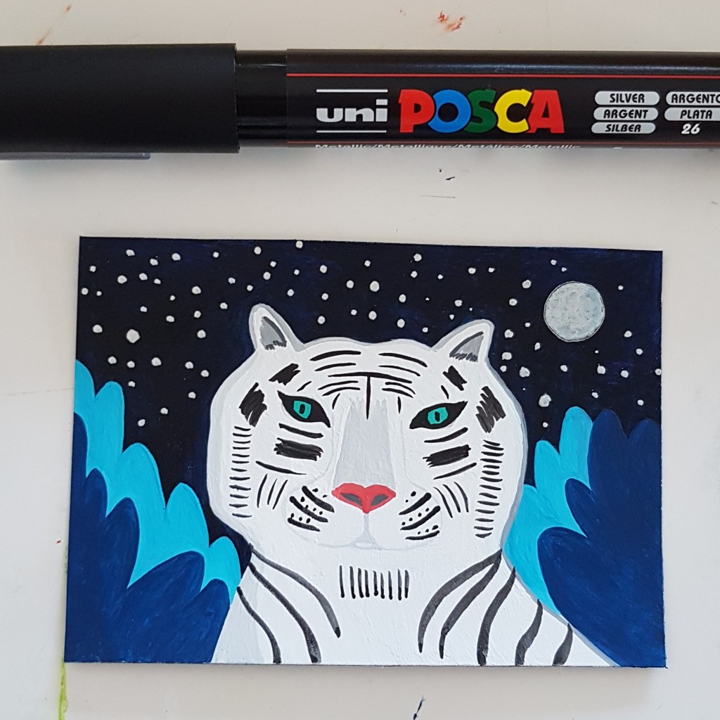 Jelly gouache and Posca pen on magnetic paper. This little tiger is living as a fridge magnet now.