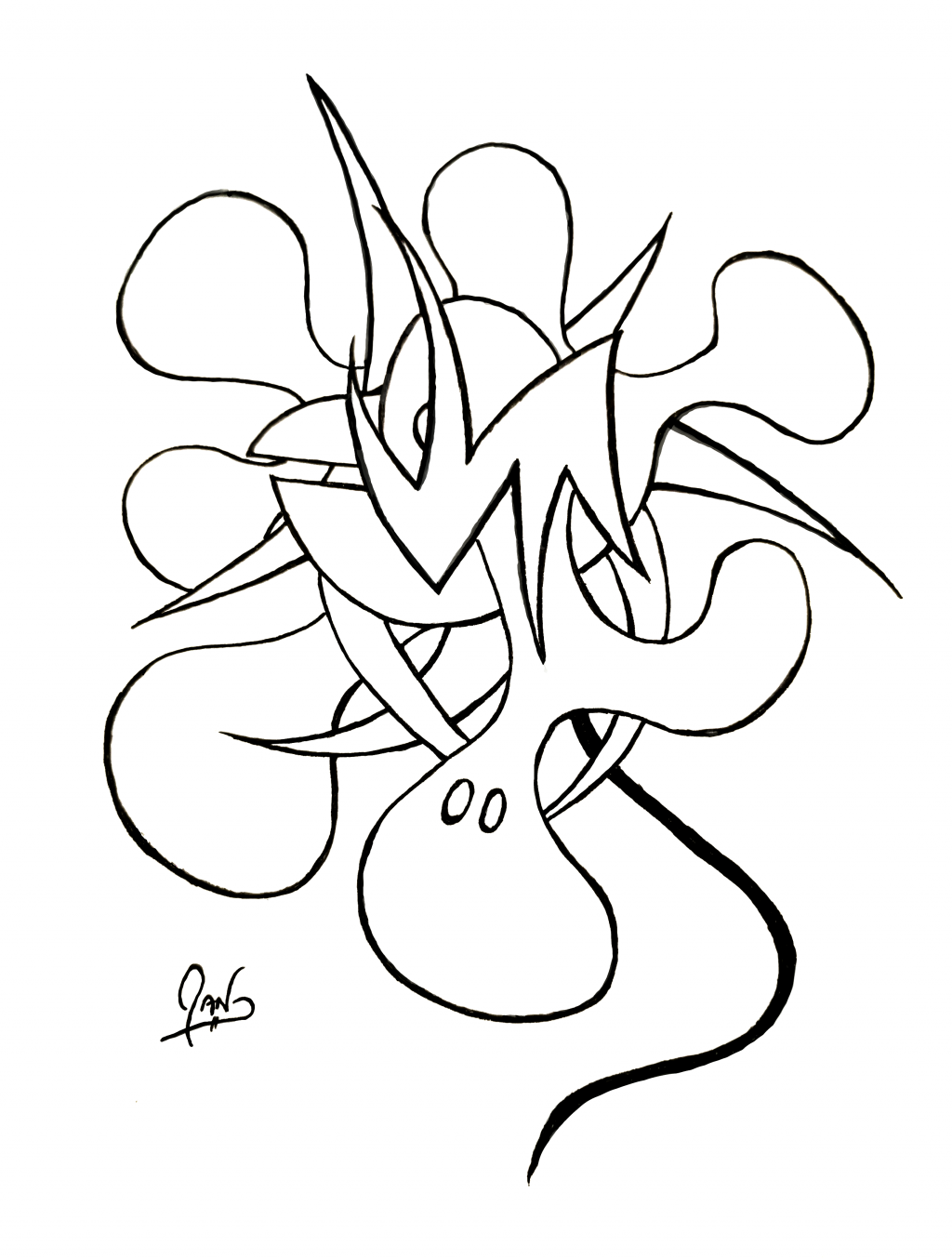 Abstract composition of thorns or horns on sour keys/soothers. Pen and paper drawing.