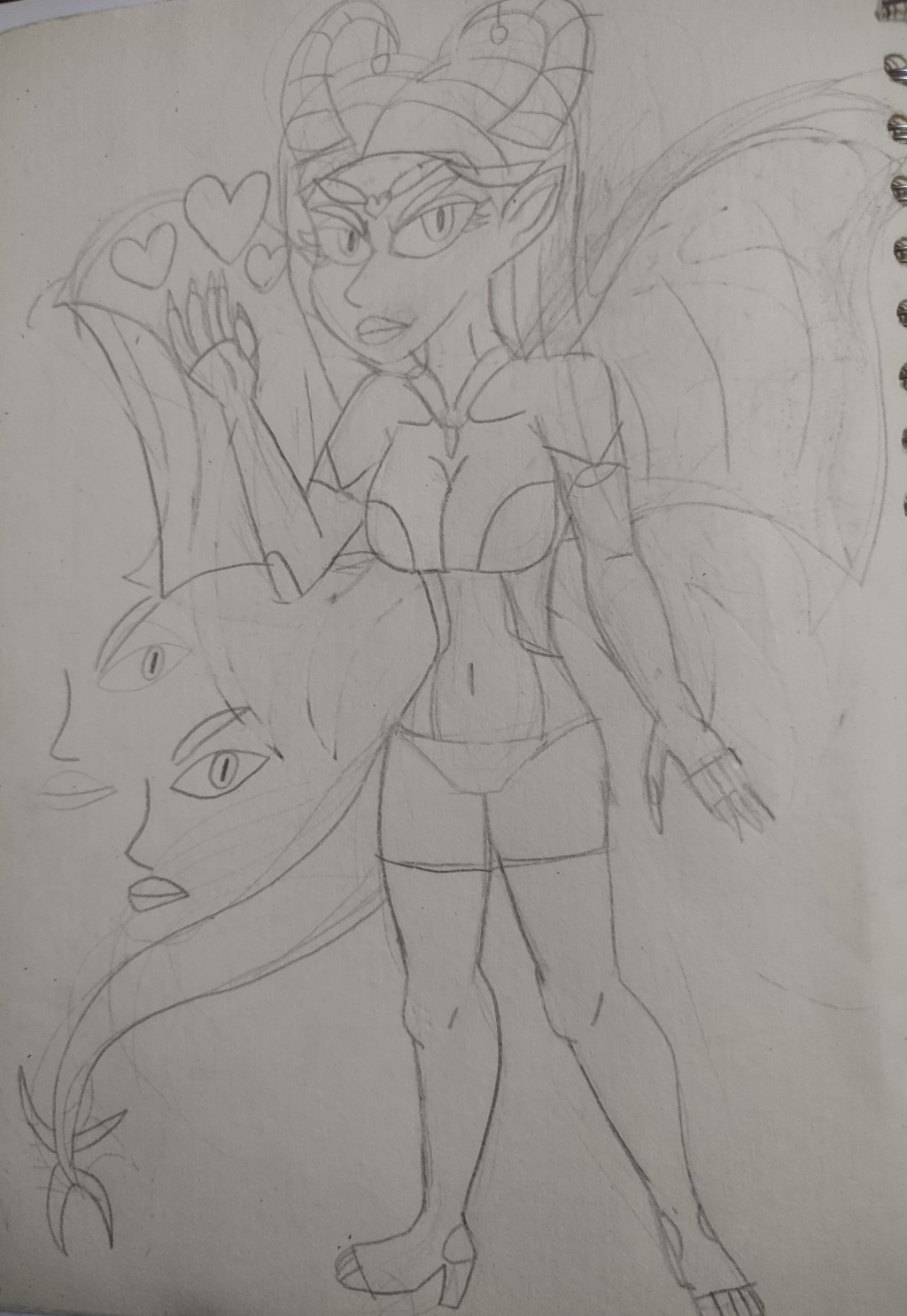 I'm not really satisfied with how it turned out,I'll definitely redesign her again soon.Shes a succubus I originally drew when I was 17 along with an Incubus named Dezeo.My inspiration came from marvel's Satana Hellstrom,I read a few comics on her.Like a lot of succubuses she drains the energy of young men and later gets rid of them.Adult Erik and Bernard were almost her victims until Gerard banishes her for good.she prefers draining the energy of young, handsome,adult men than doing what succubuses are supposed to do since it's easier for her and she likes being dominant over them.she becomes angry quickly and will fight with magic,but when she's extremely angry she turns into a hideous monstrosity (which is her true form)if anyone sees her true form,they will die.i didn't upload a sketch because I accidentally deleted it