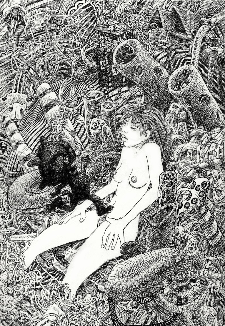 An automatic drawing, everything is out of my head with only the briefest idea of a story line. I played around with shapes and lines and shading to see what affect would result. It was fun, but time consuming.