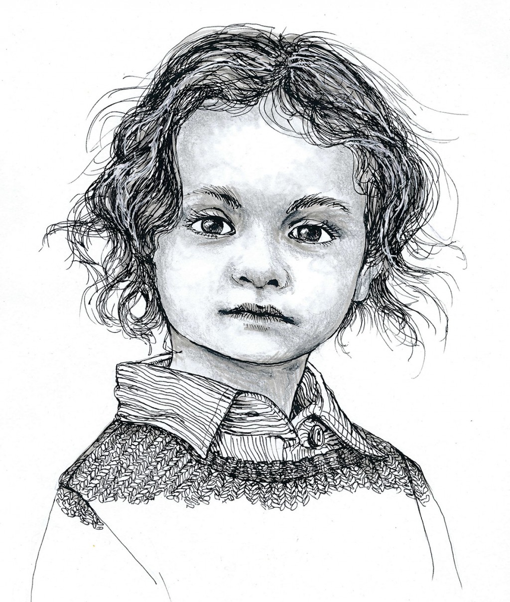 She was charming when I picked her to be in my drawing, but I didn't like her hair and I "knit her a sweater. She's a pen and pencil drawing.