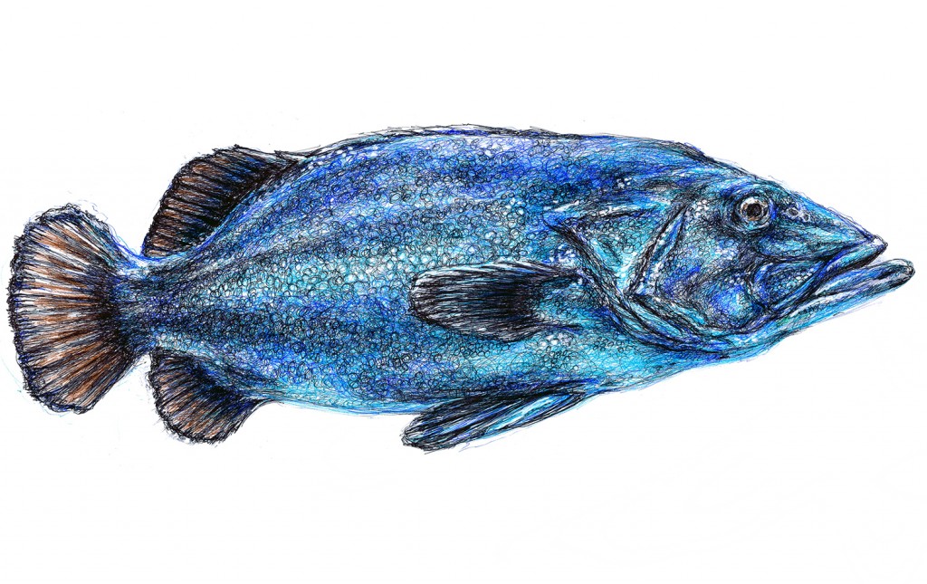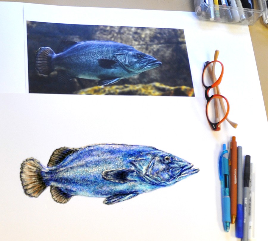 I was looking at what Pixabay might offer as inspiration, and found this fish. Perfect for a ballpoint pen drawing. The incompleted drawing in the second photo was taken before the final "glaze" of little scribbles of turquoise pen across almost the whole surface. It was a happy accident that made for a shimmery, iridescent fishy quality.