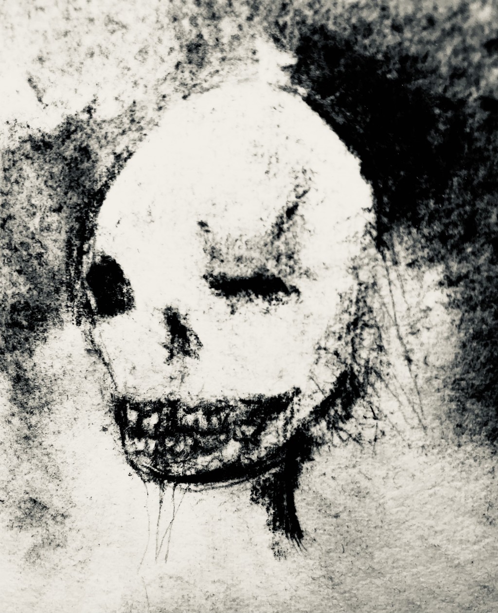 If I look at the picture it frightens me a little bit, but then some empathy of sadness kicks in. It's really very expressive with the black and white on something which reminds me on a burial cloth. It looks like a skull with a damaged eye socket who smiles but feels not like smiling. Can't stop listening it.