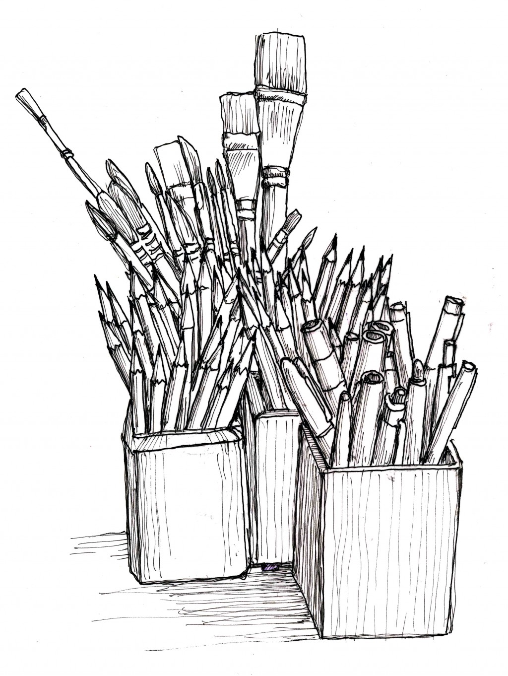 The clutter on my drawing table.. I tend to use pencils the most, with pens a close second and sometimes brushes. This is the neat look---when everything is put away in its box. More often than not, they are a bit more scattered on the surface. Micron pen drawing.