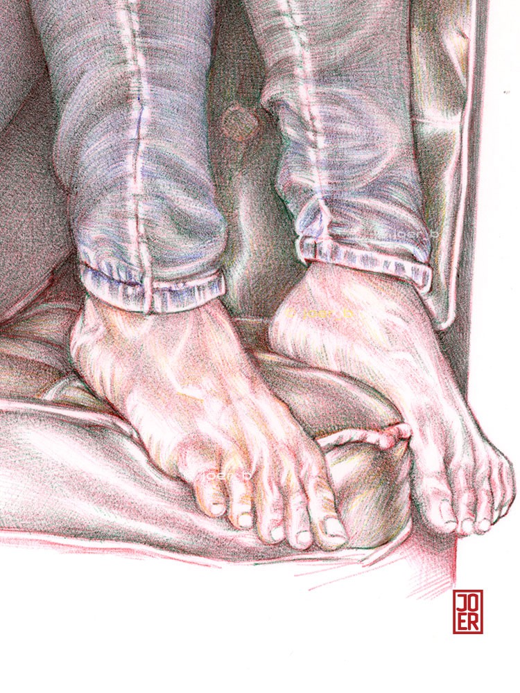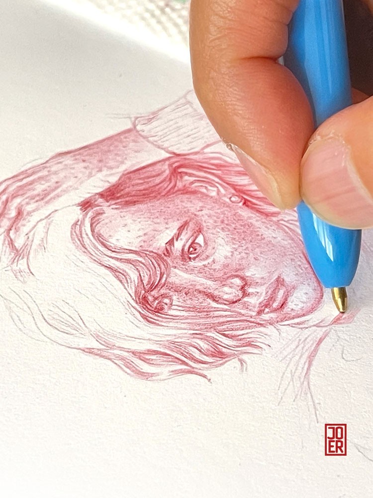 Hand pose 8 with one detail and work progression shots - started with the red pen layer, then green and finally the yellow ink (feature image).
