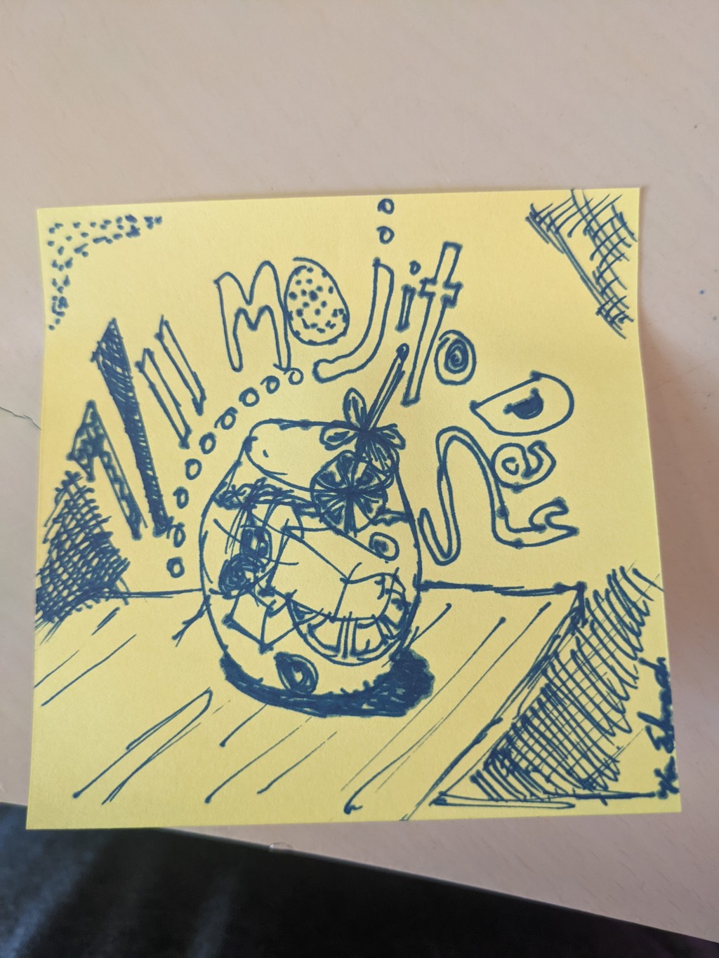 Wasn't sure what to draw. Anxiety can be a real creative block sometimes. I looked up the date and noticed it was Mojito Day. Mojitos have a pleasant vibe. Please, go easy on me. I am a digital artist but really wanna draw traditionally for these Monday doodles. Much respect everyone.