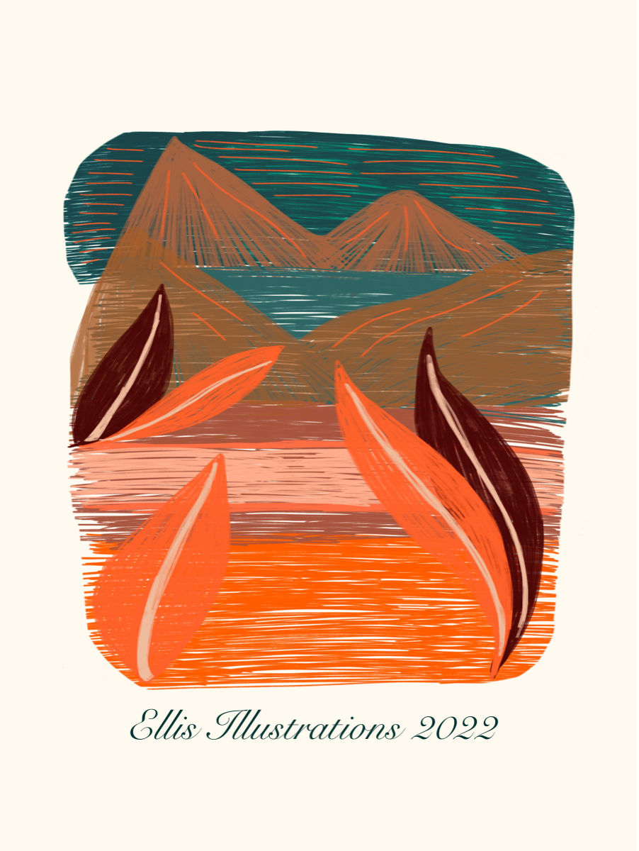 Another beautiful illustration of imaginative style and earthly tones! This is not a real scenery it just combines sea and mountains with buildings and creature like mountains with fishy style elements or wings and this into a night sky.