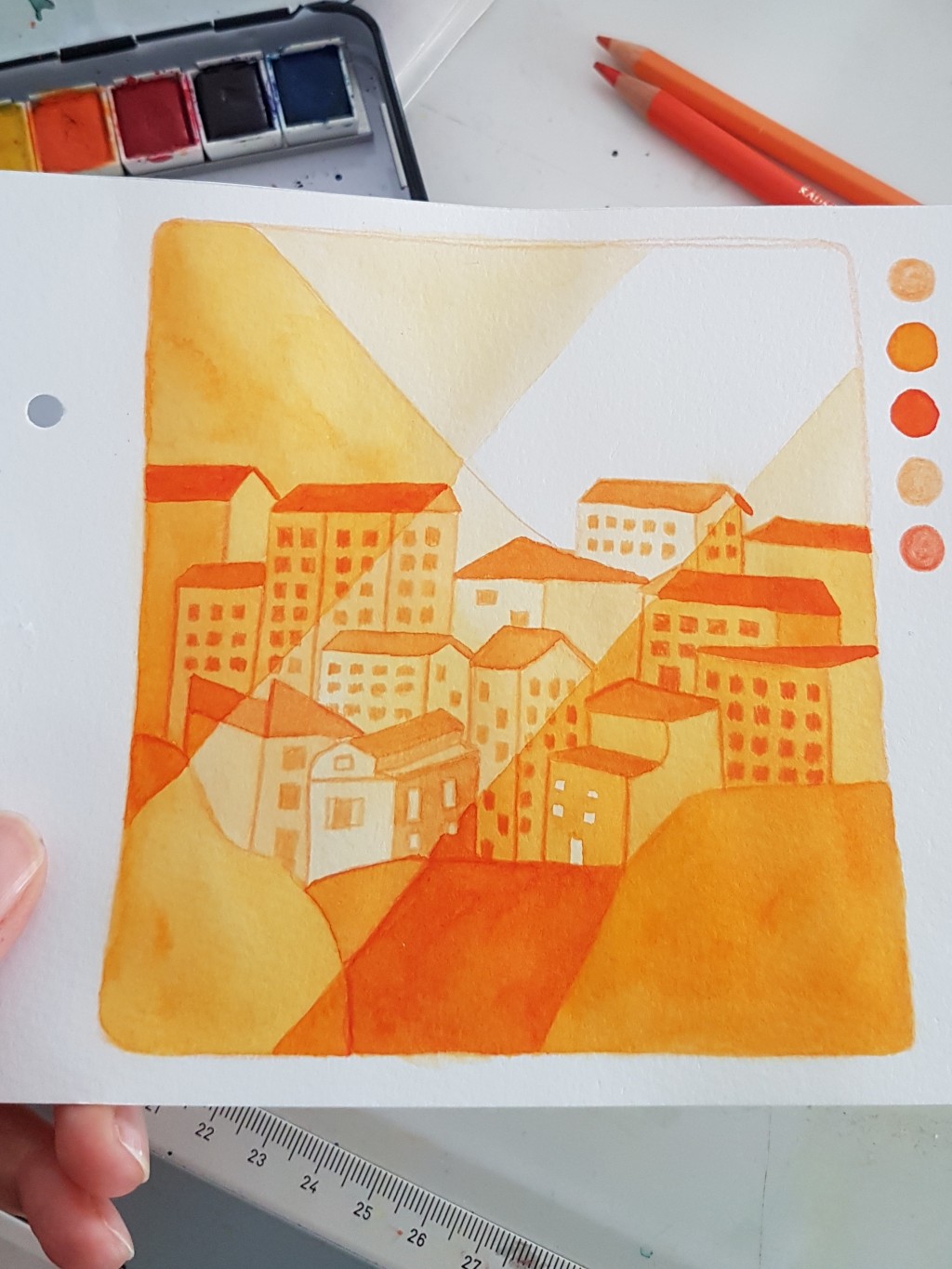 buildings, colored pencil, houses, illustration, painting, traditional art, watercolour