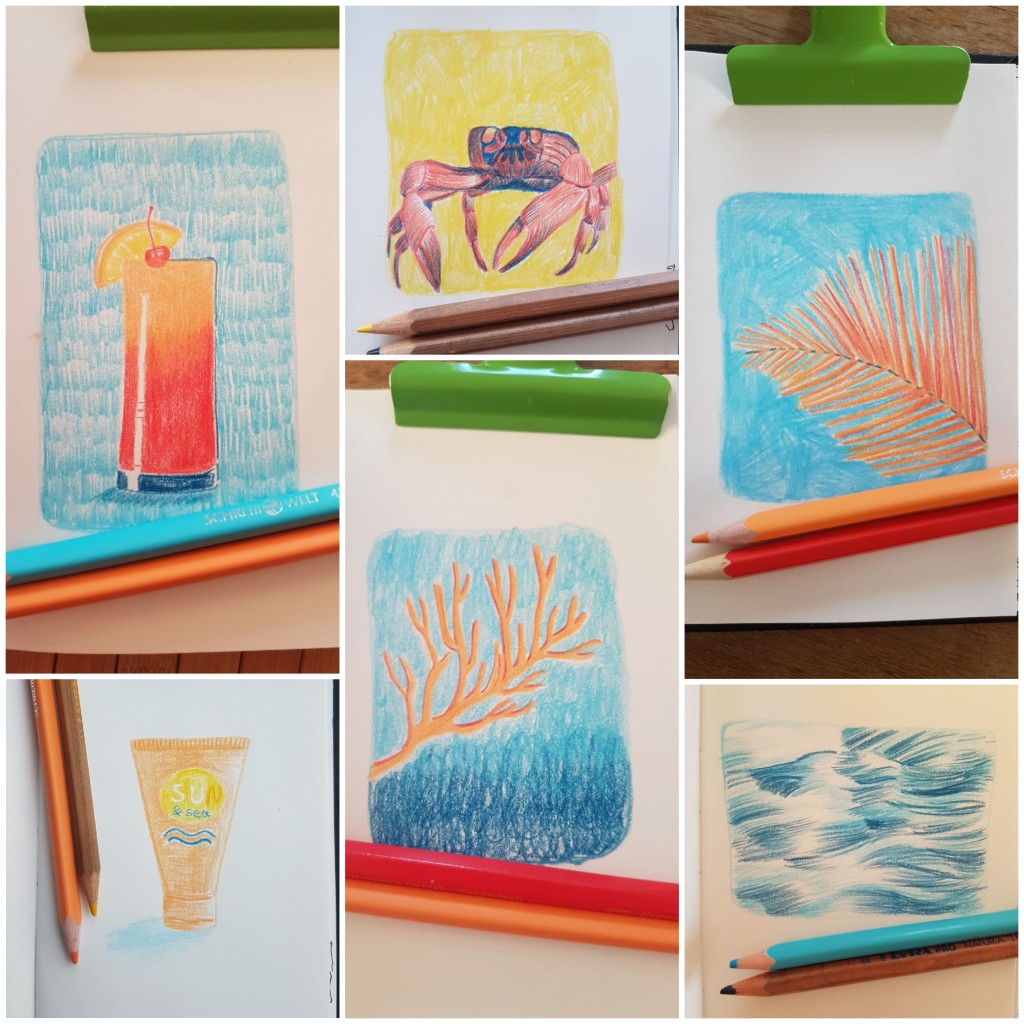 Daily doodles with a limited palette of coloured pencils.