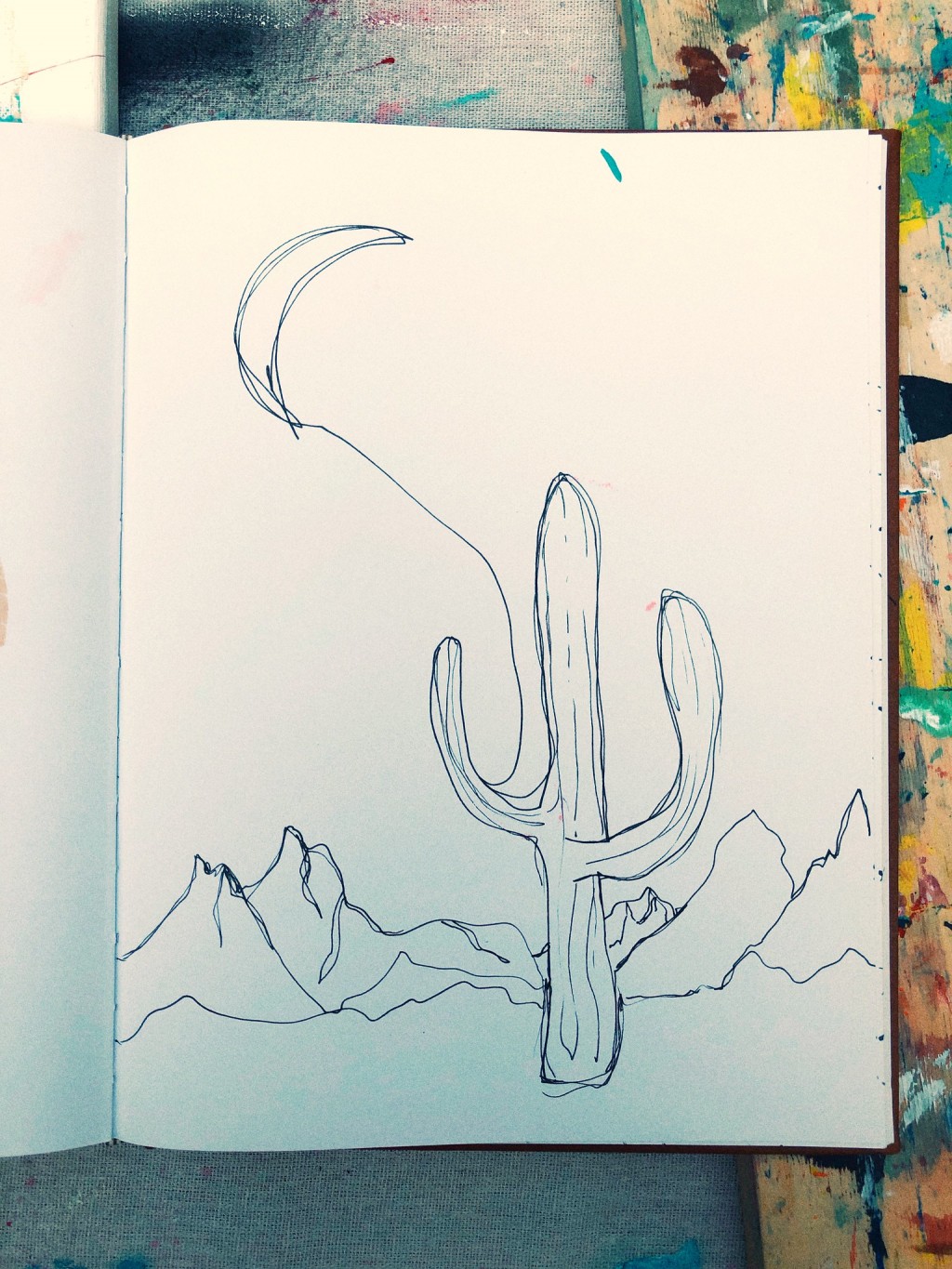 cactus, desert, drawn, illustration, moon, pal kev, single line