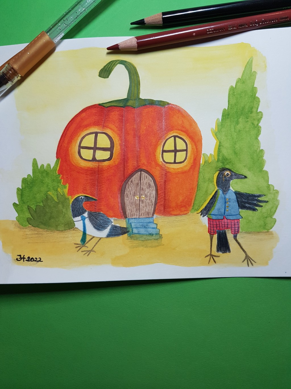 ...made of pumpkin. Done with watercolours, coloured pencil and some details in gel pen on mixed media paper.