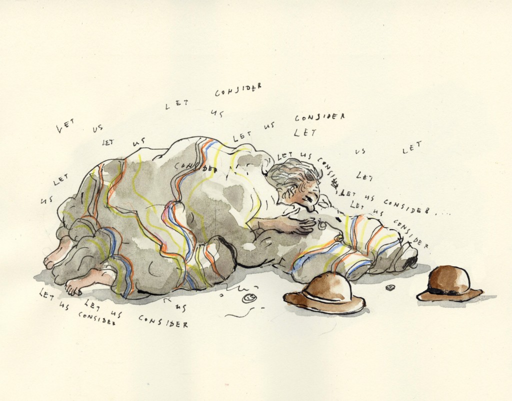 Let Us Consider from Rooster's Wife by Russell Edson Let us consider the man who fried roses for his dinner, whose kitchen smelled like a burning rose garden; or the man who disguised himself as a moth and ate his overcoat, and for dessert served himself a chilled fedora... #dailydrawing #watercolor #ink #illustration #poetry #russellEdson #dinners #moth #heartWantsWhatItWants