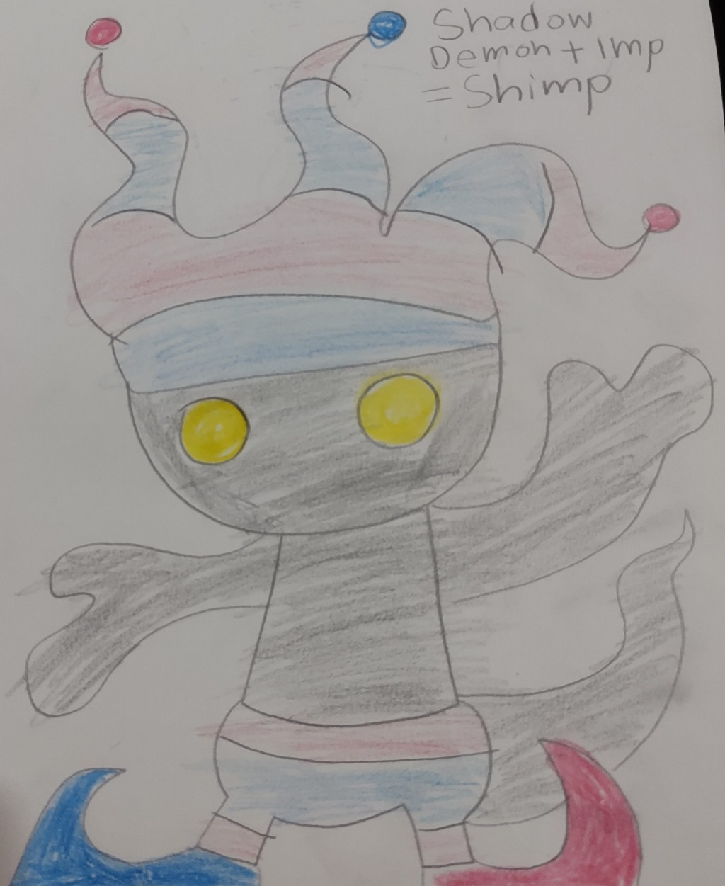 Both Jingles and Shimp don't actually speak, Jingles makes literal jingles while Shimp,a shadow demon imp hybrid is mute.both are genderless,they both love fun and both of them love causing mischief.they mean no harm and just want to play especially Shimp since they are from Hell.