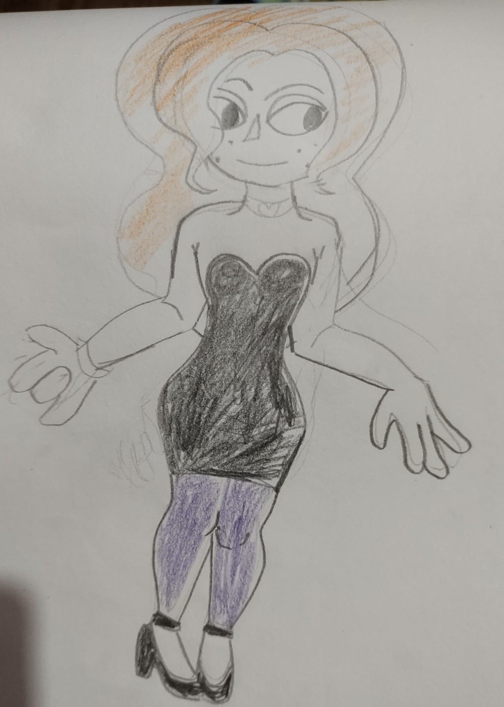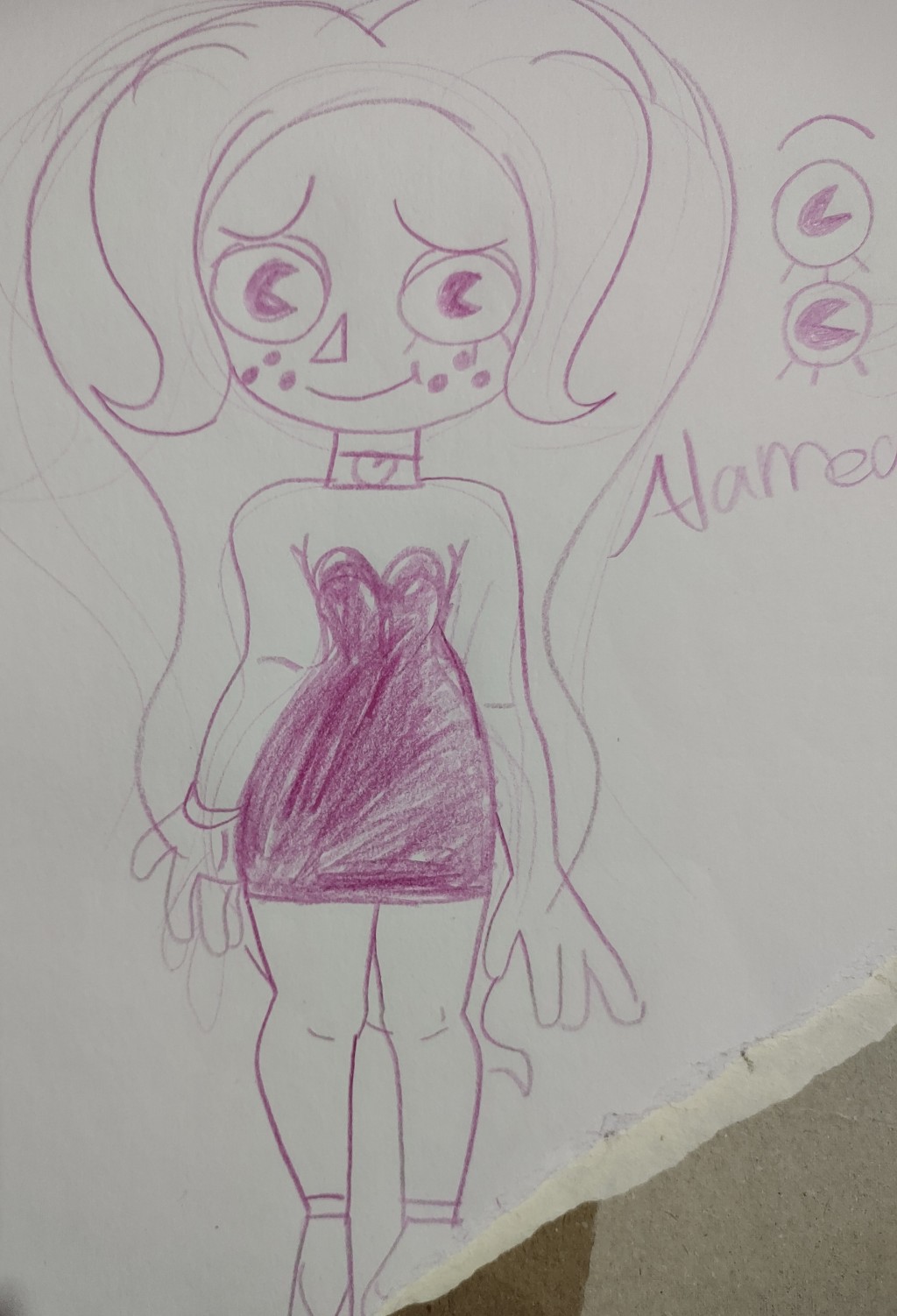 Alamea is an entertainer,singer and dancer.she is super kind, passionate and selfless.whenever she makes a lot of cash,she donates her profits to needy ghosts.at first she welcomed Al and later on falls in love with him however Al didn't want to be a a relationship with her because he's not prepared which Alamea completely understood.her old design is the design where I colored her dress black,I was really trying to make her look distinctive from Princess Neera,I gave her rubber hose eyes and a pointy nose
