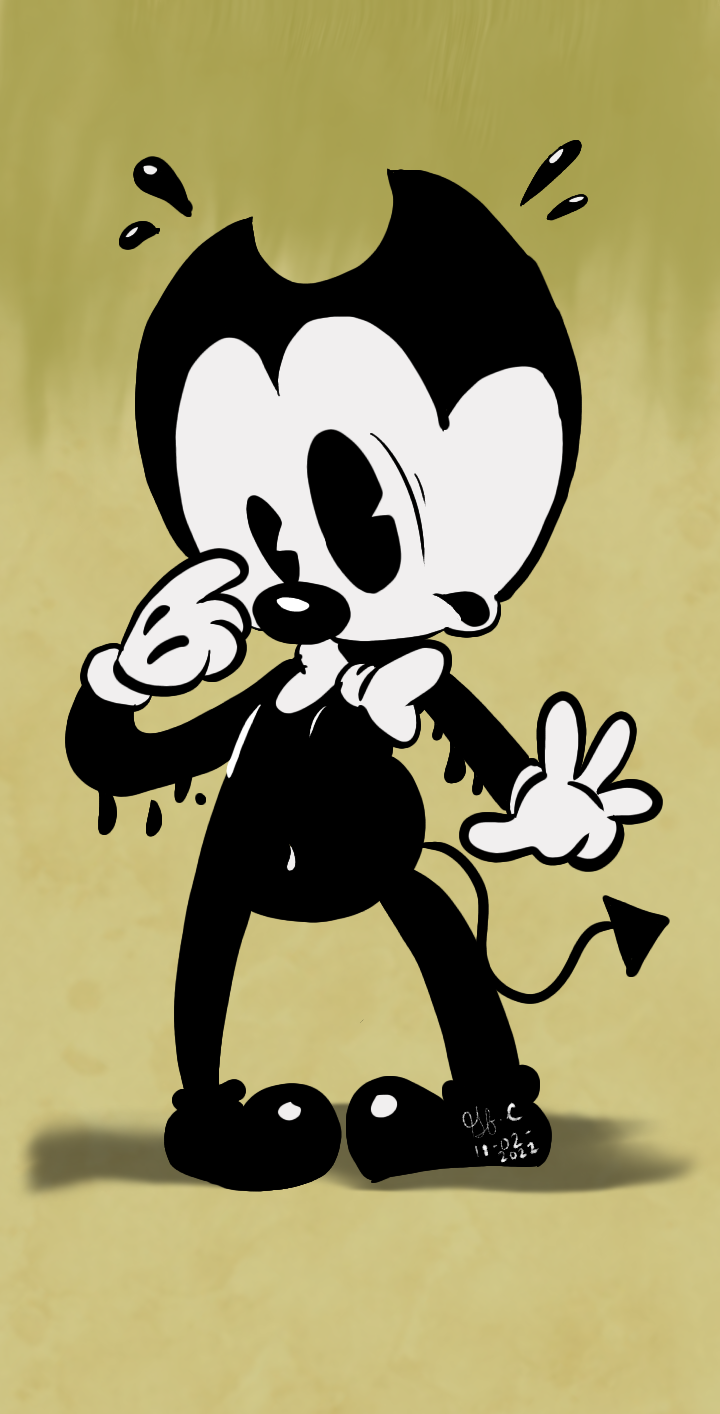 A doodle of Bendy from "Bendy and the Ink Machine" and "Bendy and the Dark Revival" with a cute button nose. X3 I've grown accustomed to seeing Bendy fan artwork of him with wings and a tail. So, why not a nose?