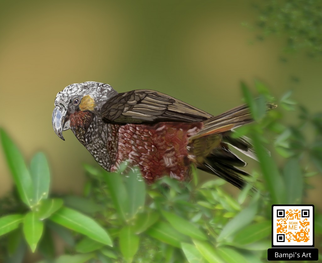 Endangered Species New Zealand Kaka... A large olive-brown forest parrot with grey-white crown, bright red-orange underwing and deep crimson belly and under-tail coverts. Males have a noticeably longer and deeper upper mandible and bigger head than females which is apparent when the two are seen side by side. (QR Code Expired) https://nzbirdsonline.org.nz/species/kaka Listen: https://nzbirdsonline.org.nz/sites/all/files/03%20-%20Track%203_0.mp3