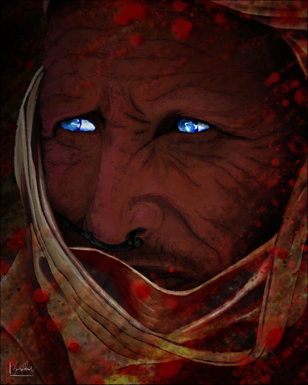 Inspired by the Fremen from Dune. Blizzard white and blue eyes on a face thats been in the grinding desert many years. Painted with Rebelle and Flame Painter
