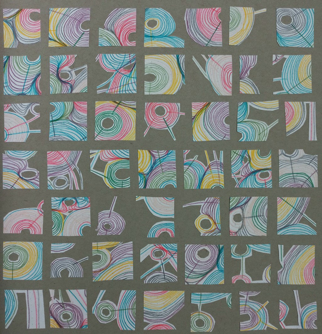 collage, colored pencil, doodle, grid, paper, squares