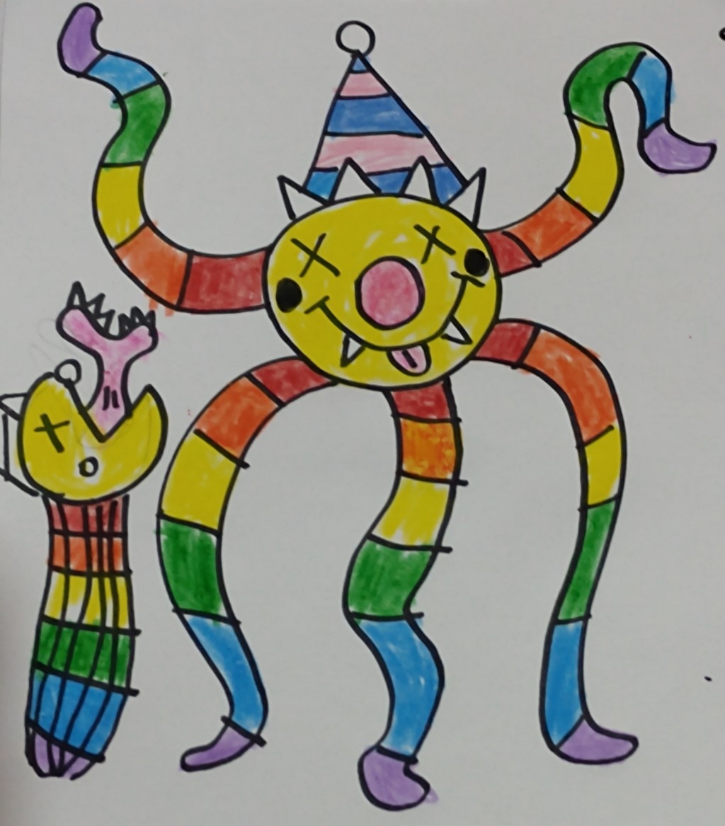 I know it's not a great drawing at least the colors are sort of nice (I love crayola twistables) I unfortunately can't draw this digitally at the moment.the black cheek marks are actually it's eyes.
