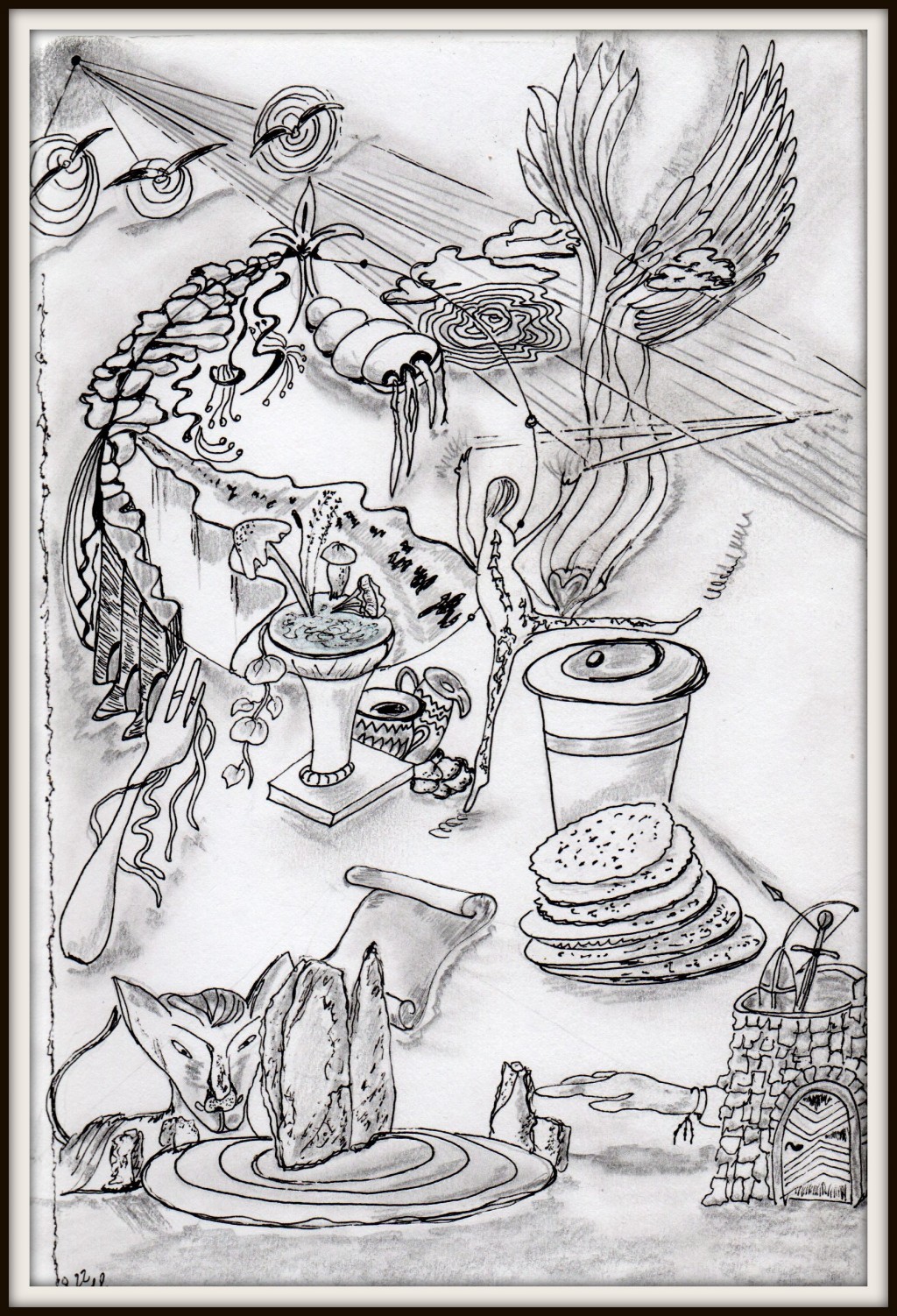 Drawing From the series "on the way of imagination" made with a fineliner, pencils and using a digital image of my doll. dimensions are double x 14/9 cm