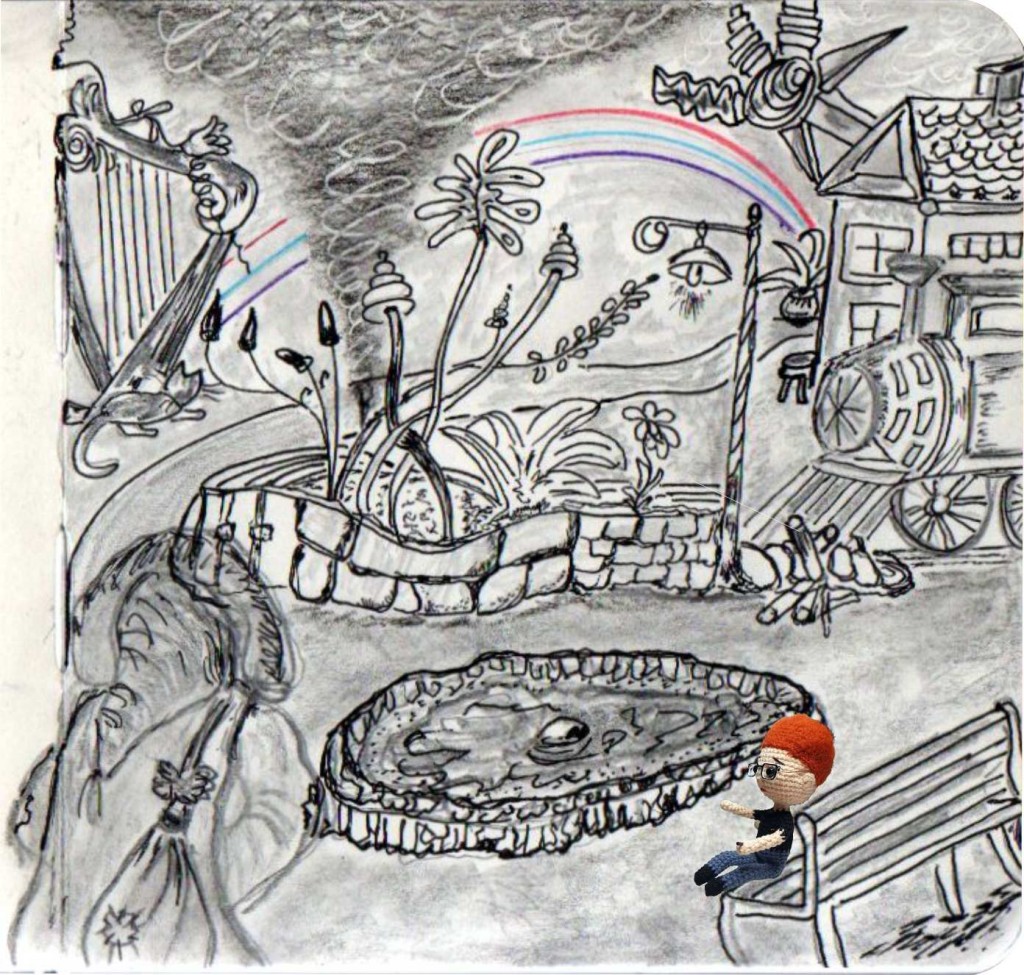 Drawing From the series "on the way of imagination" made with a fineliner, pencils and using a digital image of my doll. dimensions are double x 14/9 cm