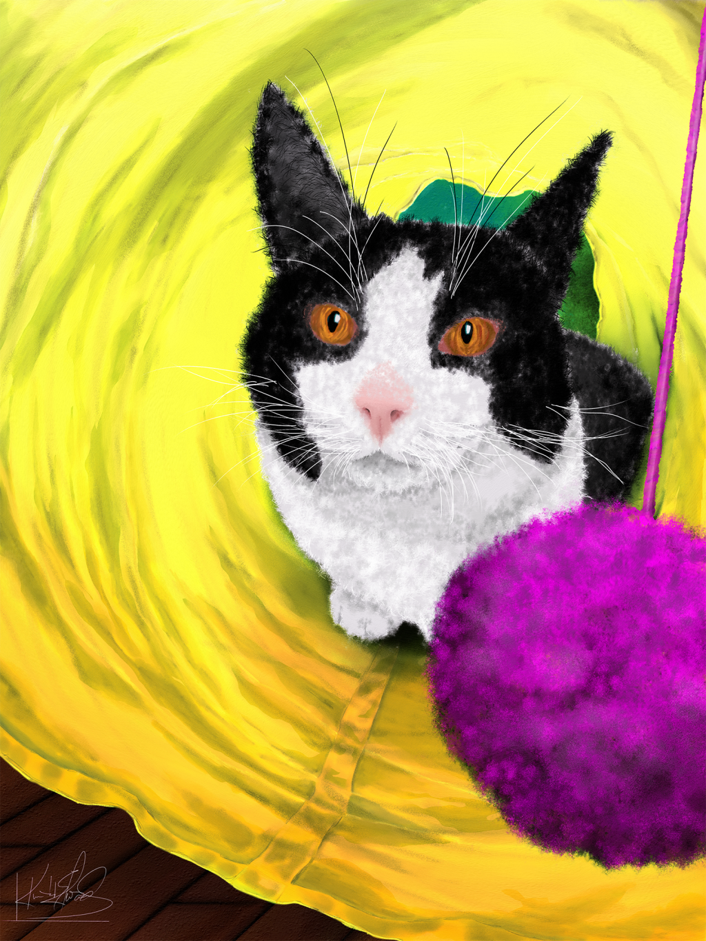 I painted one of my cats, Banana, in a cat tunnel. The coloring in the photo was muted, so I worked on color and fabric texture. I am thrilled with her facial expression, and the overall composition feels good. This is not AI nor is any element made from AI.