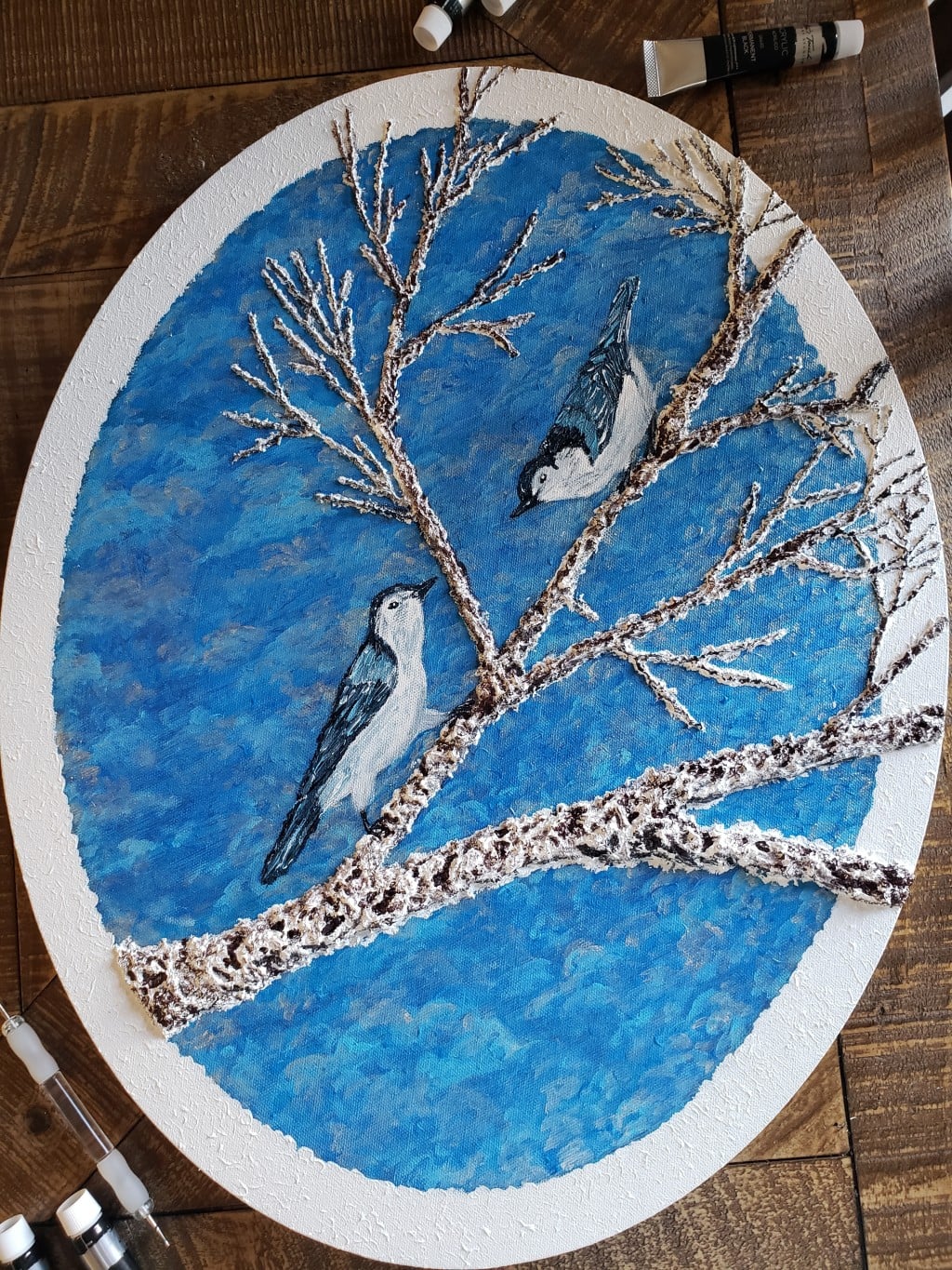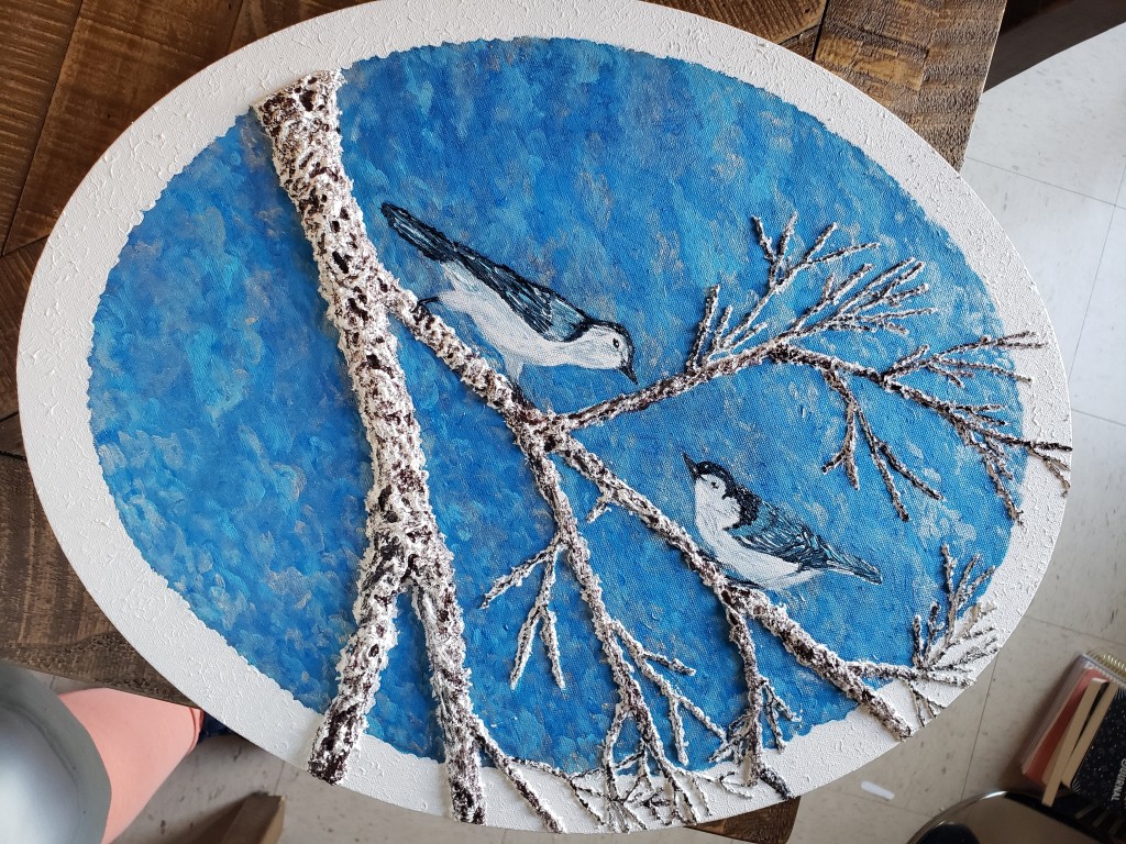 Acrylic painting that has the clouds that change depending on where the lighting comes from. Birds having fun on a Winter day.