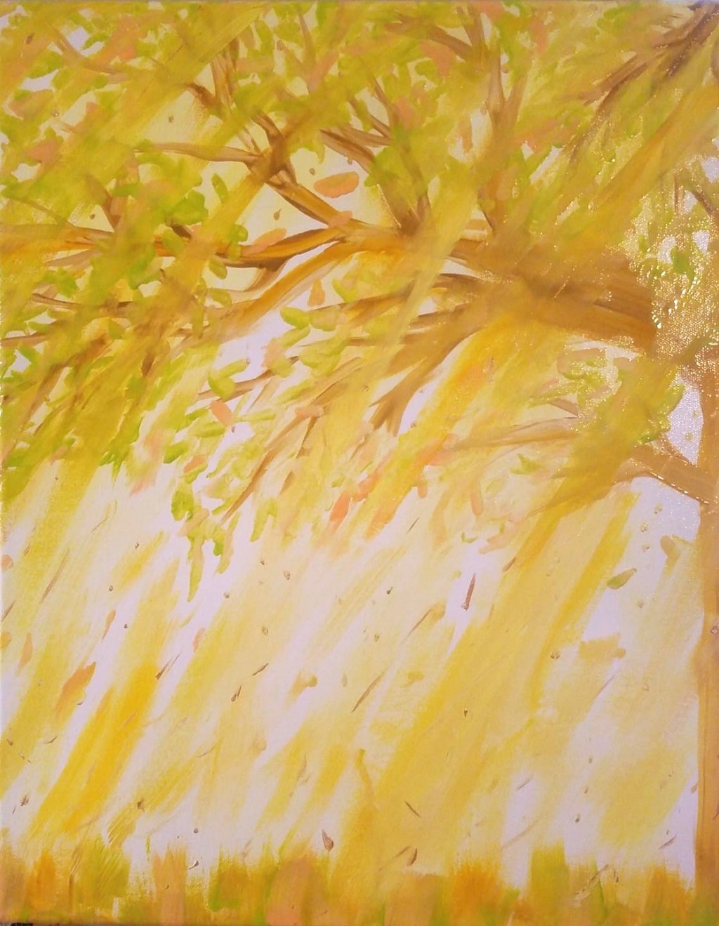 Acrylic painting of our back yard tree on a sunny day with the wind blowing.