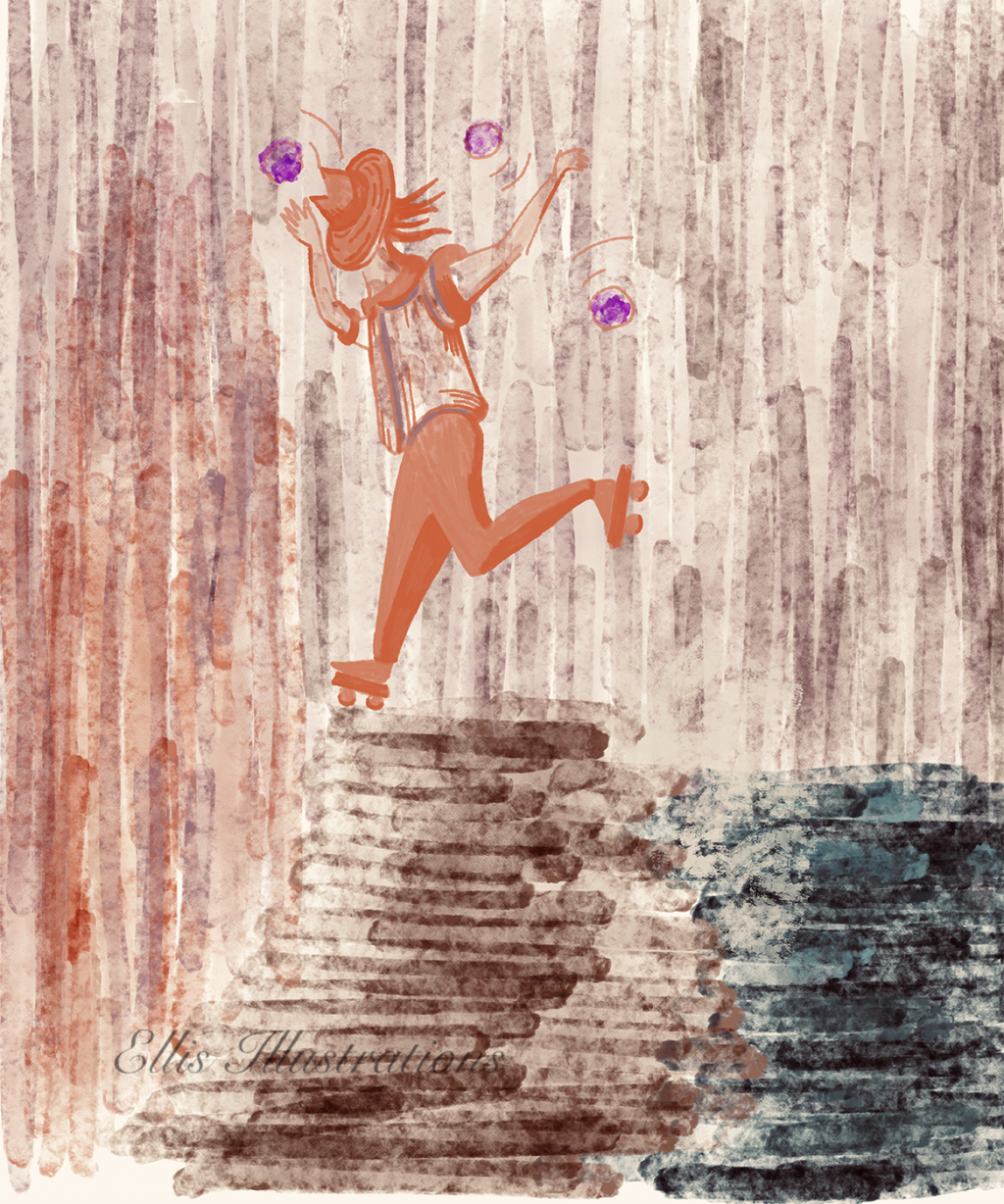 Another beautiful illustration for today! This is someone playing near the shore on a windy day with some waves and rocky style beaches. The weather seems odd to be out and about outside and this woman keeps her balance courageously against the streams of cold, while her hat is covering her face only because of the stormy weather, she still seems to know what she is doing while she seems to be enjoying this! Another little story for today with another scenery!