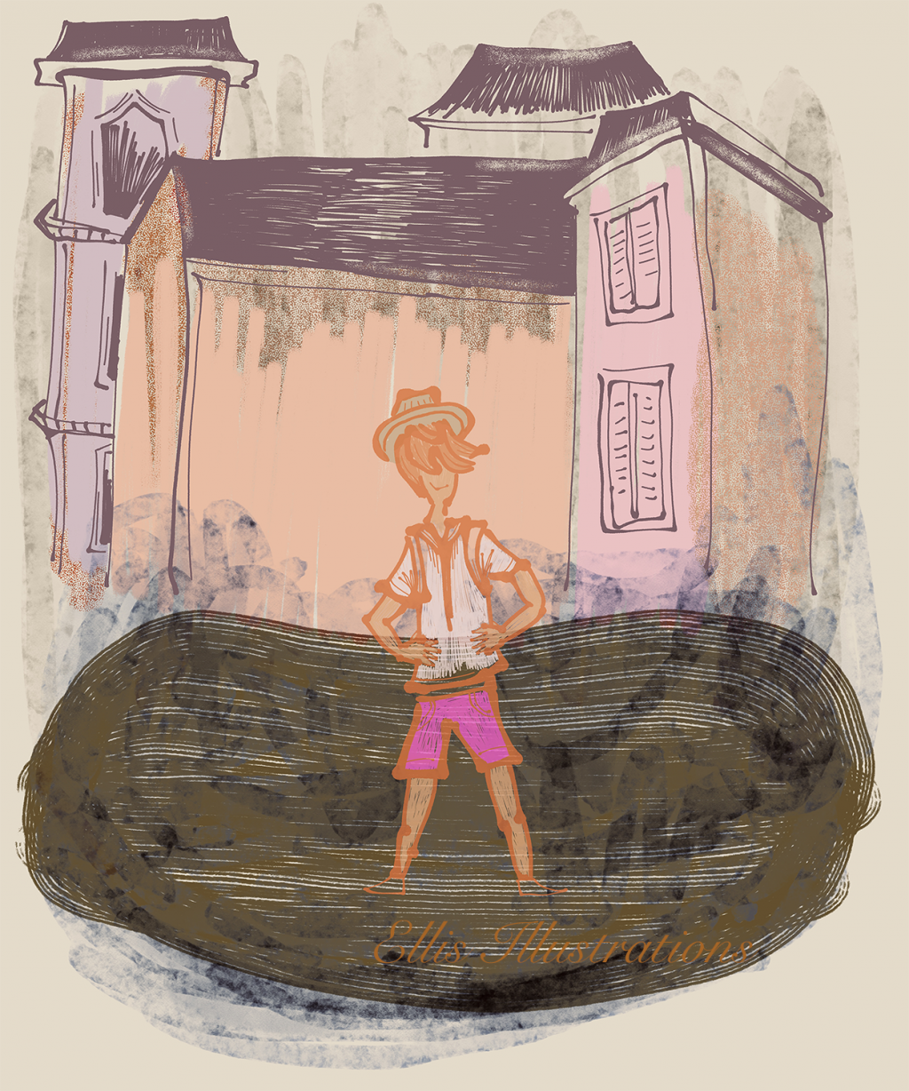 Another illustration with comics painterly style about a character who is out and about looks like they might be tourists enjoying some urban or town discovering new things a great way to simply spend time outside.