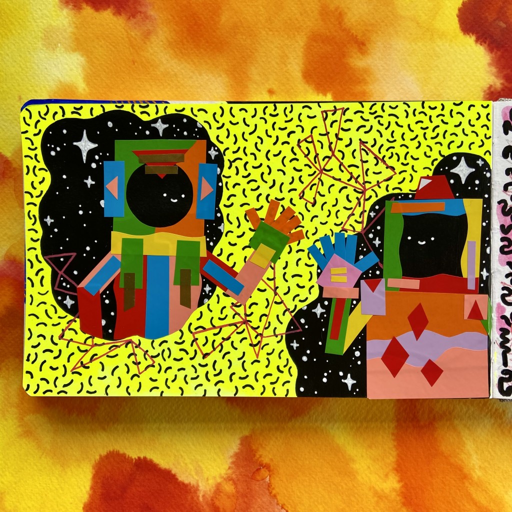 Sketchbook page with robots made with scrap vinyl.