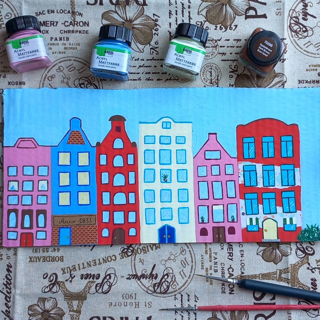 acrylic, collage, houses, mixed media, painting, traditional art