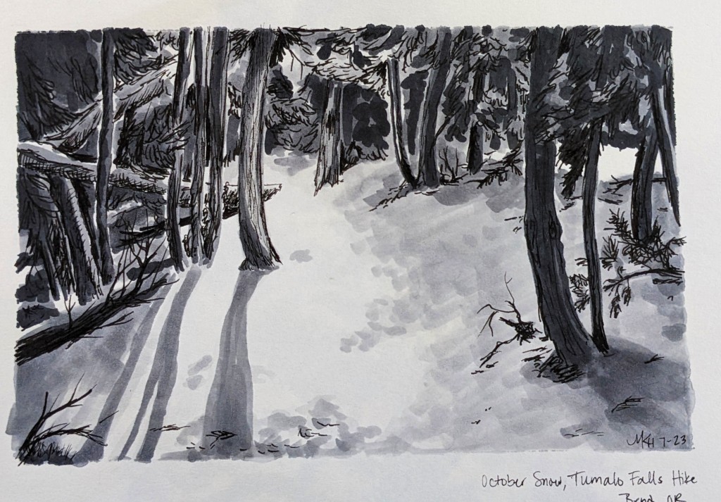 Freehand sketching in ink from a photo reference I found online, to practice conveying that lots-of-stones look without drawing all the stones (photo credit: K. Mitch Hodge). Micron pens + alcohol markers.
