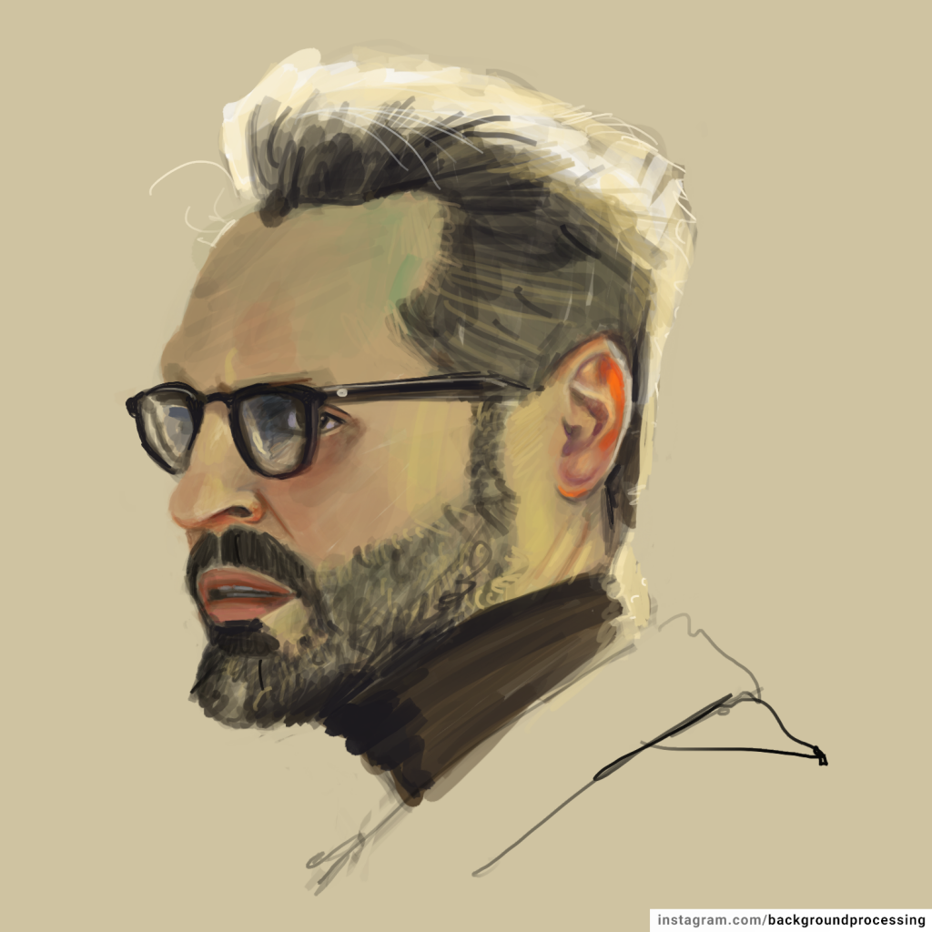 Succinct brushstroke yet accurate and vivid representation of the subject, and beautiful lighting too - I especially like the halo-like effect above his hair. BTW, what painting app did you use? I've never tried digital painting, but it seems like a potential convenient option if one doesn't want to carry painting gears around.