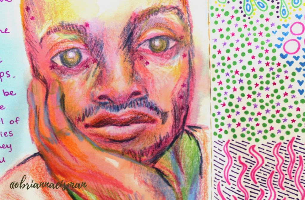 This portrait was created using mixed media like colored pencils, markers, and ink. The portrait features the face of a man resting in his hand, and staring dead-eyed at the viewer. I used non local color techniques to create depth and form using colors not typically found in the human face, like blues and violets for shadows and yellows and oranges or highlights. Parts of his face include small pink stars which originally faded from the previous page, but I really like the look it gives, they almost look like celestial freckles.