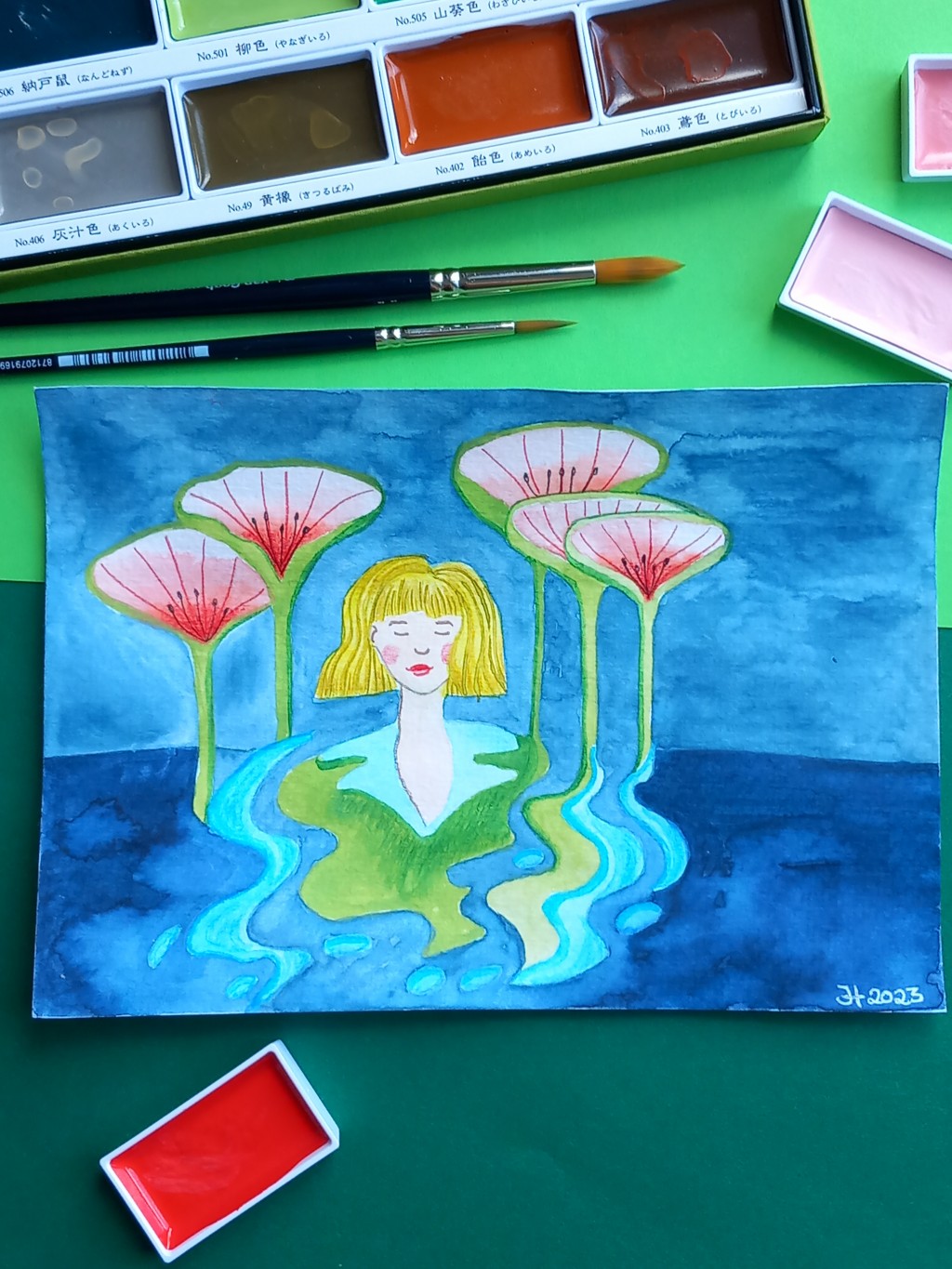 Painted with the Kuretake Gansai Tambi art noveau set and coloured pencil.