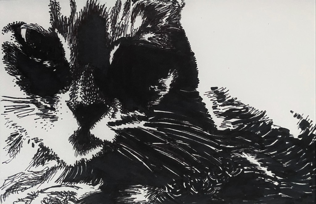 This is a black marker drawing using Sharpie pens on white paper. The drawing is my cat posing like the incredible pet model she is. I miss her.