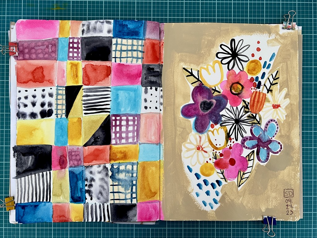 A mix of watercolor and India ink held together with some fun doodle motifs.